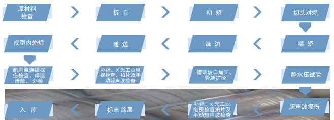 原材料開卷—平整—端部剪切及焊接—活套—成形—焊接—內(nèi)外焊珠去除—預(yù)校正—感應(yīng)熱處理—定徑及校直—渦流檢測—切斷—水壓檢查—酸洗—最終檢查(嚴格把關(guān))—包裝—出貨。